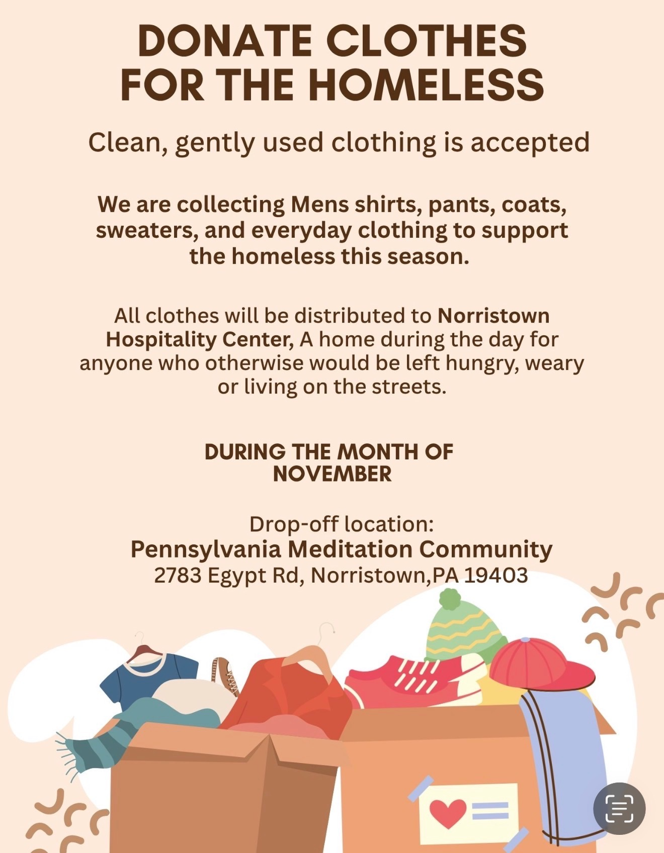 We are collecting clean, gently used men’s shirts, pants, coats, sweaters and everyday clothing to support people experiencing homelessness this season.
