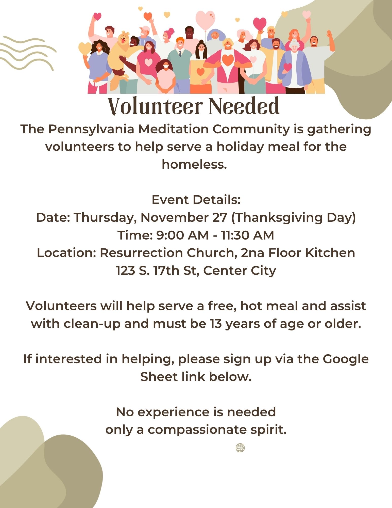 The Pennsylvania Meditation Community is gathering volunteers to help serve a free, hot holiday meal for the homeless and assist with clean-up. Volunteers must be 13+ years of age.