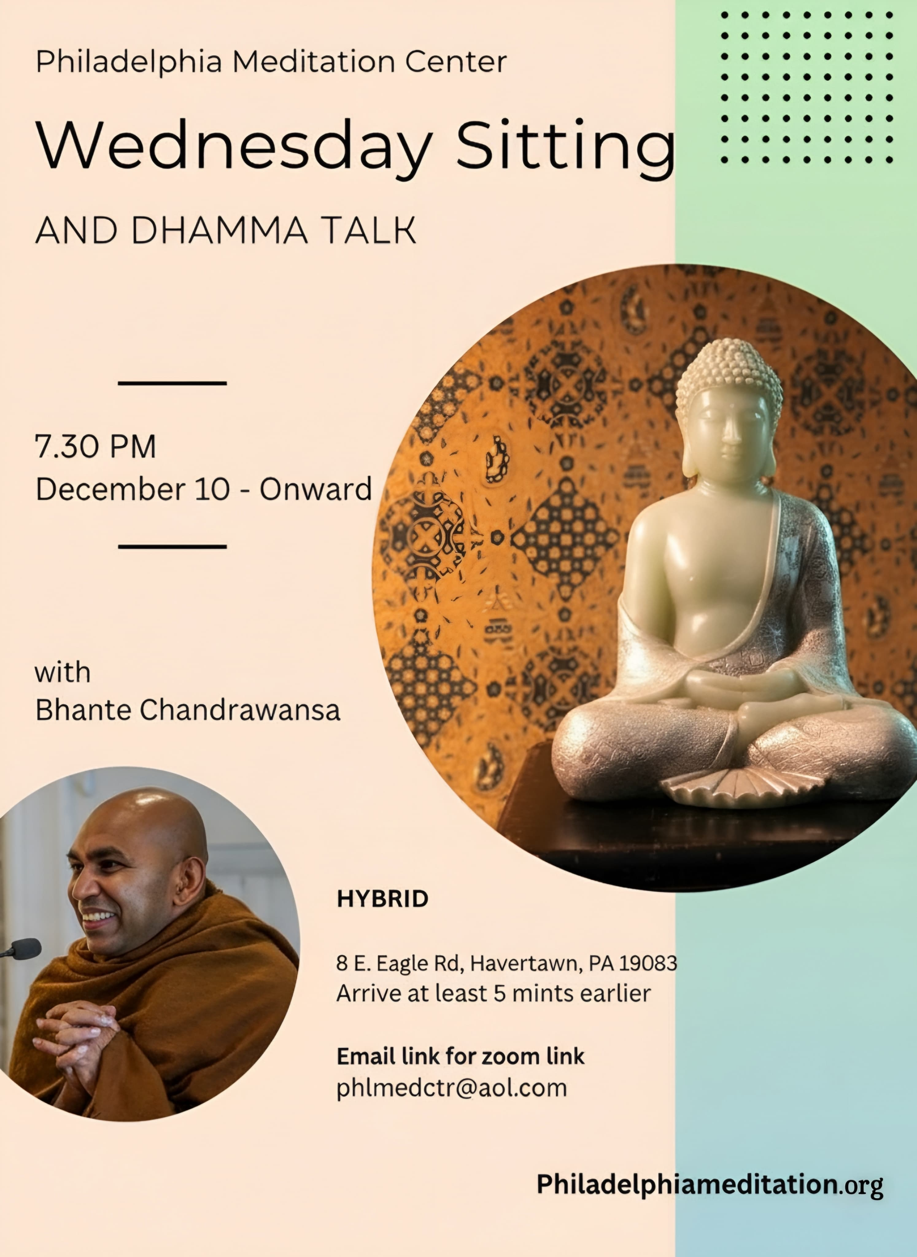 Join us as we partner with the Philadelphia Meditation Center for weekly hybrid Wednesday evening classes and a monthly Saturday retreat day with Bhante Chandrawansa.